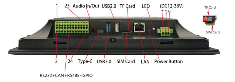 O BERRY-PPC-101CA72 possui vários conectores de expansão, incluindo conectores USB 2.0 e 3.0, um conector Tipo-C, um conector LAN, e conectores RS232 e RS485. Também possui um conector de áudio de 3,5mm e um slot para cartão TF.