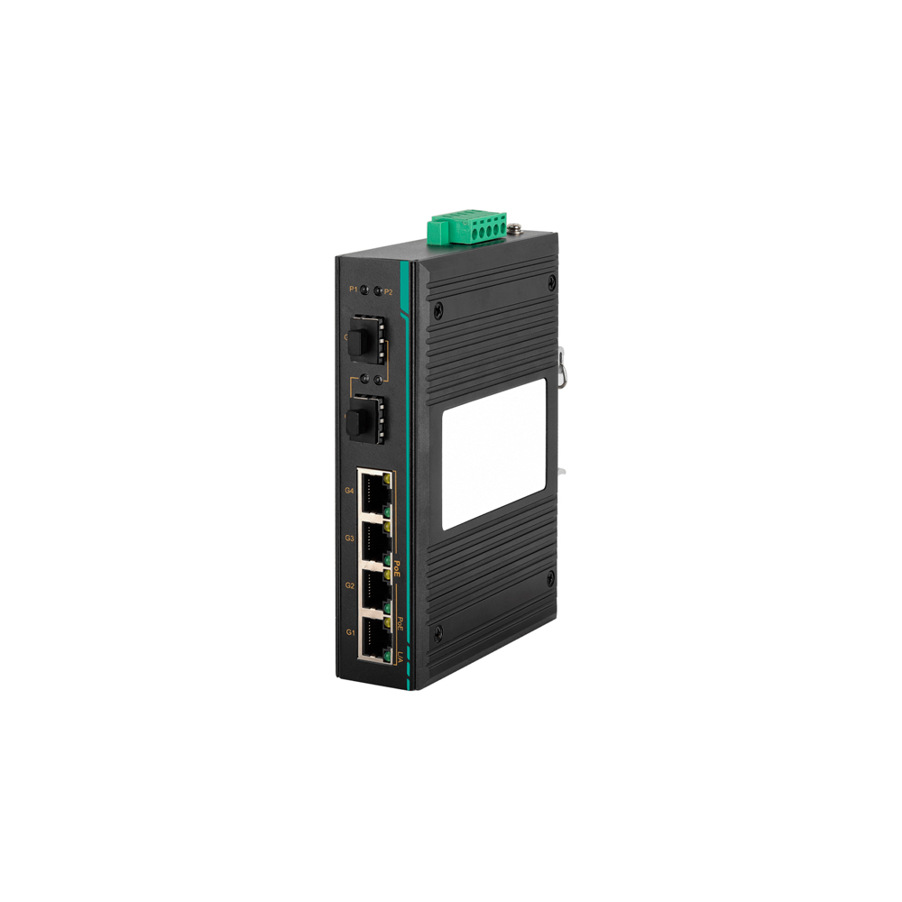 COM-ISNGL2-6P-3206GP-2GF-4GTPOE – Switch Ethernet Industrial Layer 2 PoE – 6 Portas, 4×10/100/1000M PoE, 2xSFP 1G, Alimentação DC48~52V, Montagem Trilho DIN